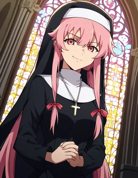 yuno gasai, 긴 머리, 분홍색 눈, 분홍색 머리, 미소, 낮은 트윈테일,