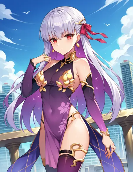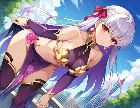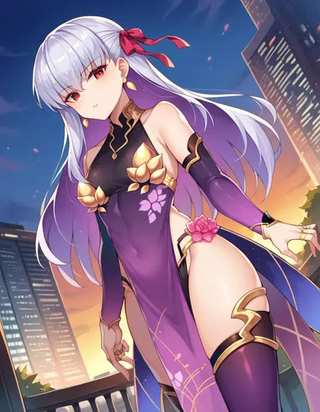 팔찌, 어깨 노출, 비키니 갑옷, 팔찌, 목걸이, 분리된 소매, 드레스, 귀걸이, 플로럴 프린트, 보석, 금속 목걸이, 미니스커트, 골반 커튼, 보라색 드레스, 보라색 스커트, 보라색 소매, 보라색 허벅지 스타킹, 반지, 스커트, 허벅지 스타킹, 허벅지 띠,