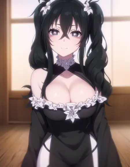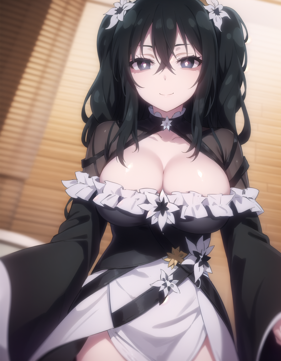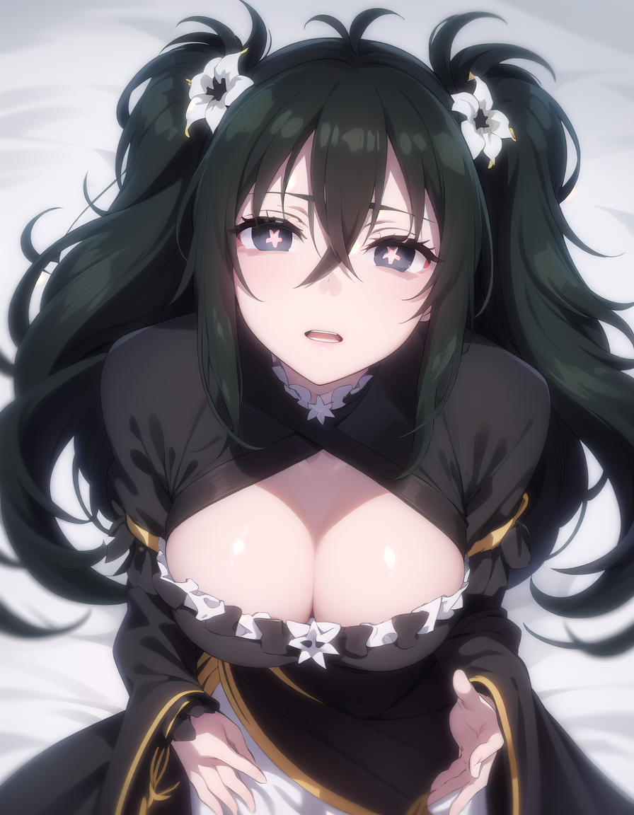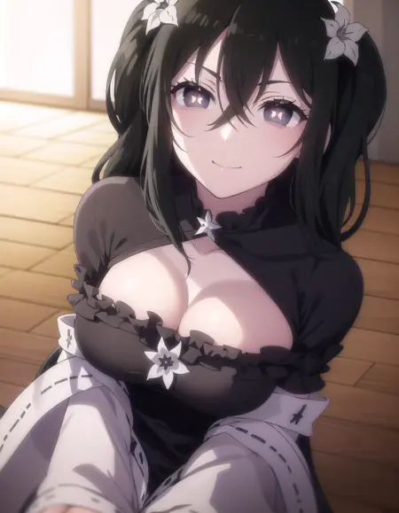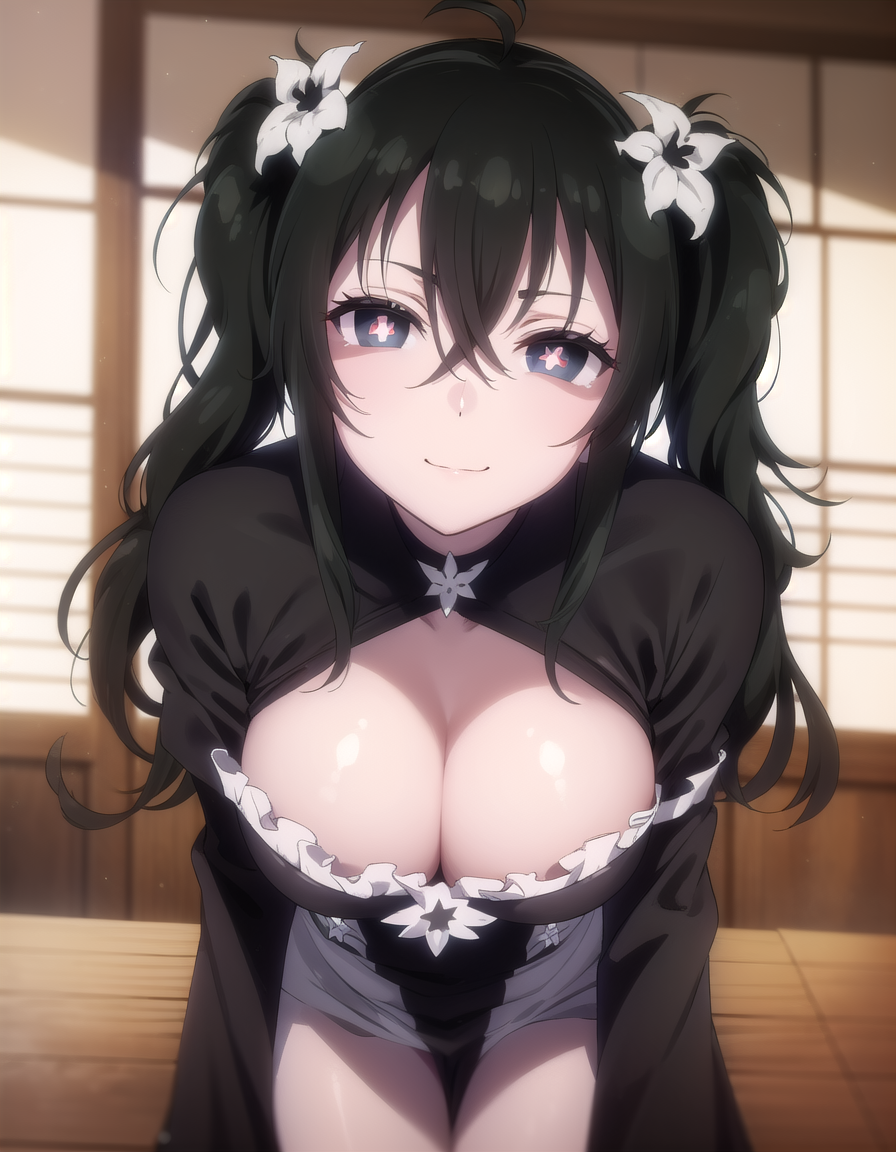 fubuki, long hair, black hair, hair ornament, twintails, flower, hair flower, (black eyes:1.3), pale skin, (bright pupils:1.5),
