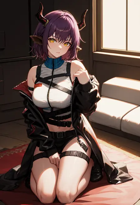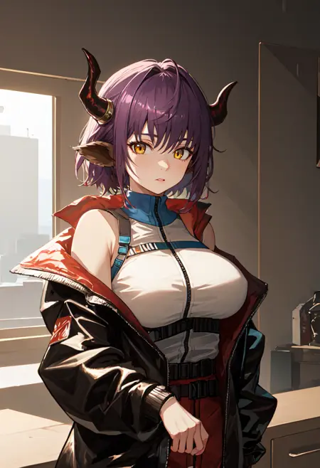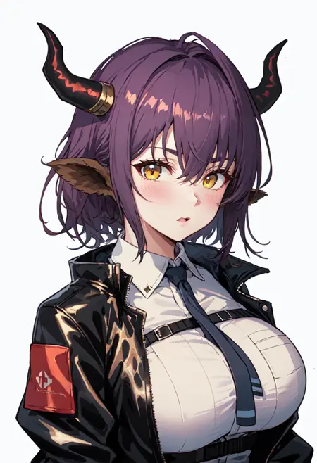 The trigger word is sideroca_arknights, and the pruned tags are animal_ears, horns, cow_horns, purple_hair, cow_ears, breasts, short_hair, cow_girl, large_breasts, yellow_eyes, visor_cap, tail, cow_tail, brown_eyes. When some features (e.g. hair color) are not so stable at some times, you can add these them into your prompt.