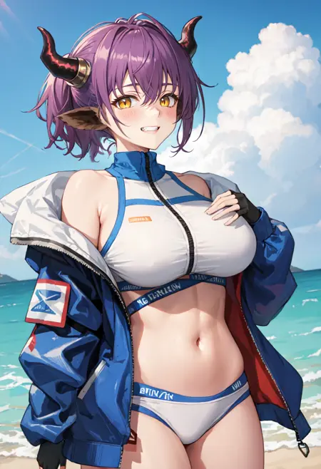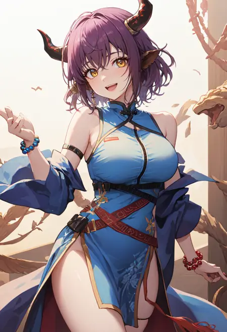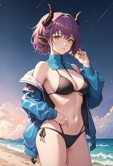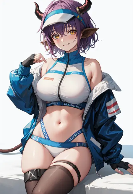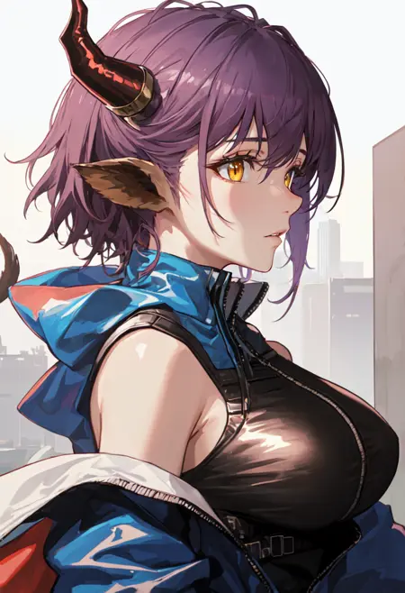 - The pruned character tags are animal ears, horns, cow horns, purple hair, cow ears, breasts, short hair, cow girl, large breasts, yellow eyes, visor cap, tail, cow tail, brown eyes. You can add them into prompts when core features (e.g. hair color) of character is not so stable.