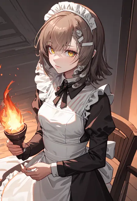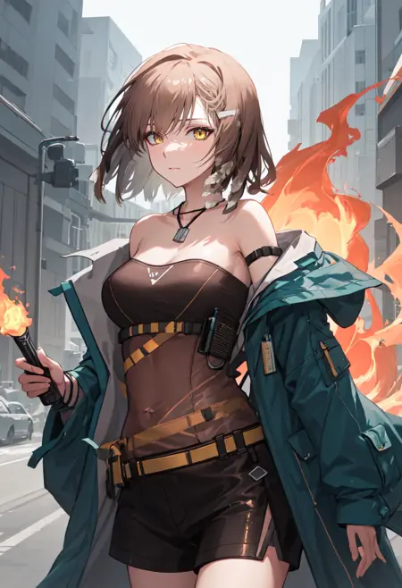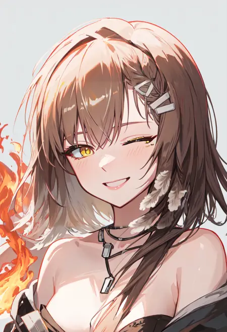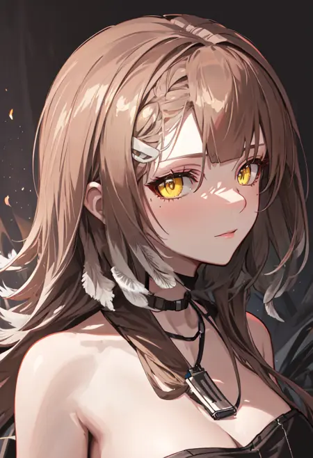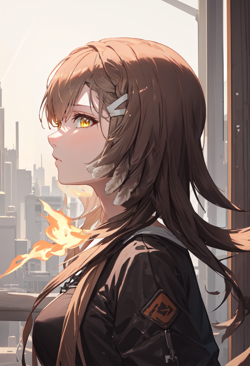 The trigger word is firewhistle_arknights, and the pruned tags are brown_hair, breasts, long_hair, yellow_eyes, hair_ornament, hairclip, medium_breasts. When some features (e.g. hair color) are not so stable at some times, you can add these them into your prompt.
