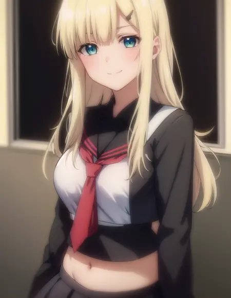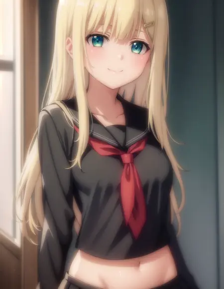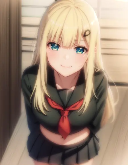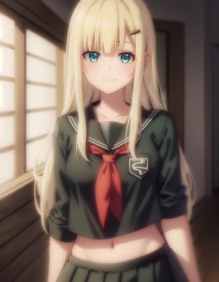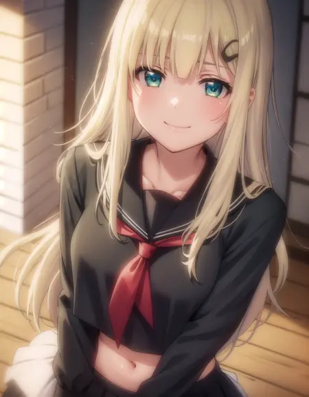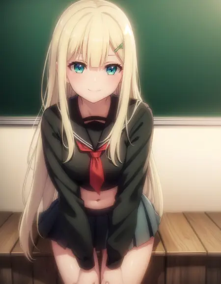 yomi, long hair, blonde hair, hair ornament, (green eyes:1.3), hairclip, bangs, blunt bangs,