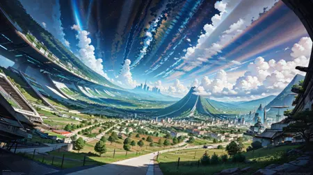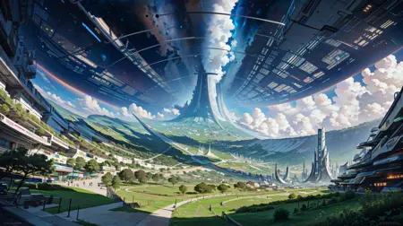space-clony, scenery, outdoors, tree, building, sky, city, cloud, science fiction