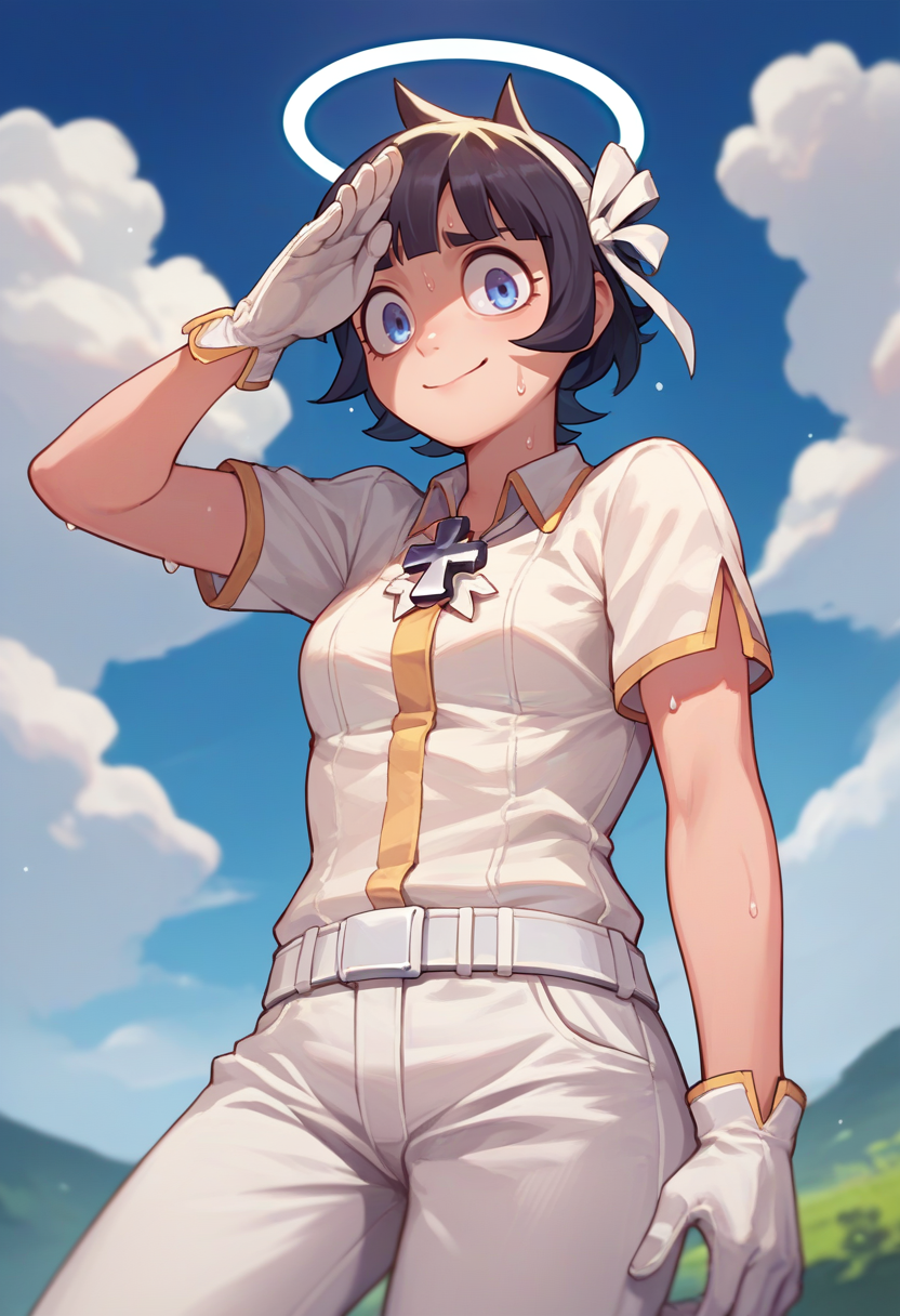 Default Outfit: white shirt, short sleeves, white gloves, white pants, white belt, cross necklace