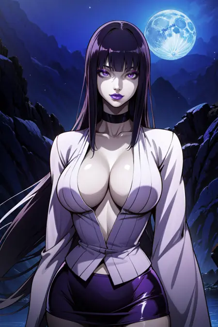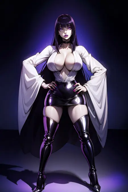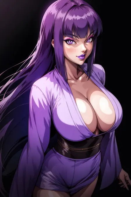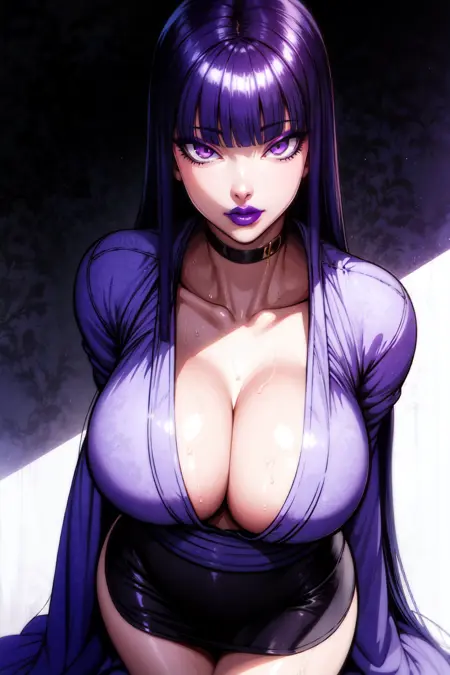 long hair, black hair, blunt bangs, hime cut, grey eyes, makeup, purple lipstick, large breasts, nail polish, purple nails