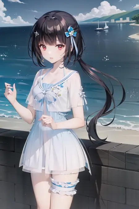 追加オプションプロンプト:dress, hat, flat chest, red eyes, side ponytail,