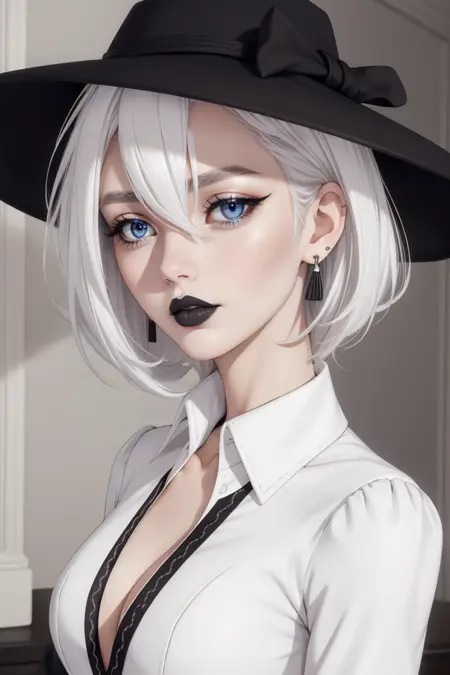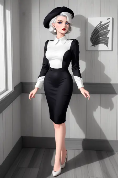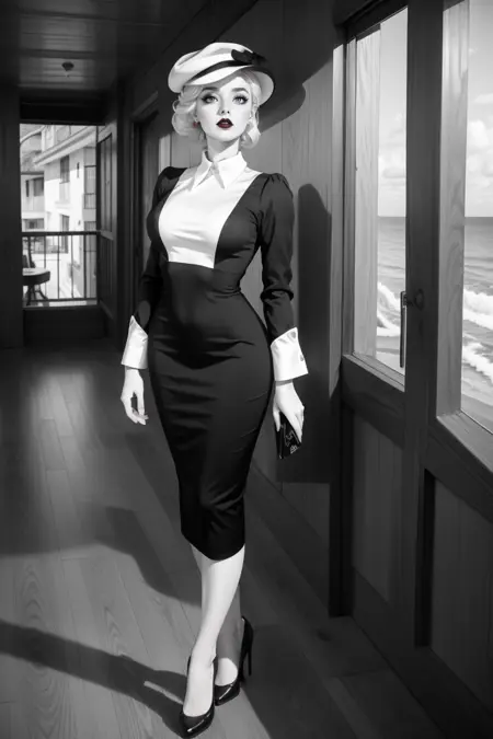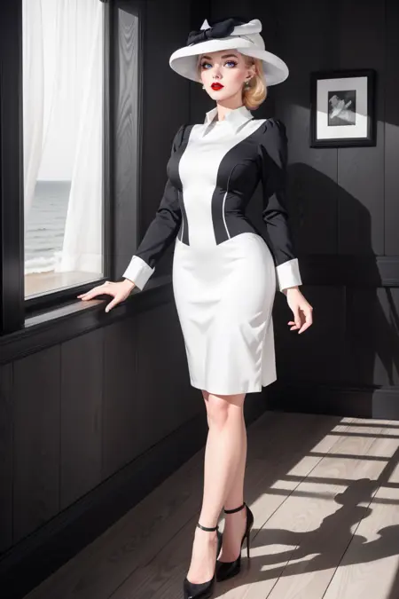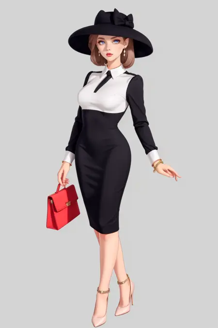 キーワード: hud_vintag、長袖、(ブラックのVネックの铅筆スカートドレス)、白いブラウス、 cuffs、イヤリング、ブレスレット、帽子