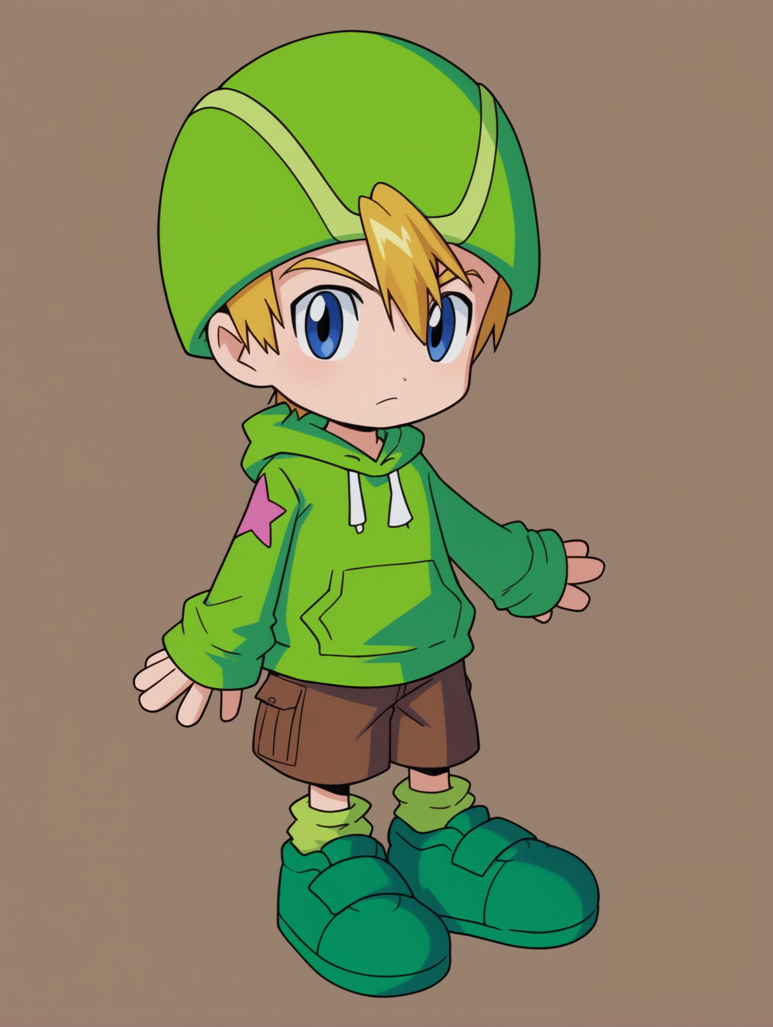 Takeru: 1boy, solo, takeru, short hair, blue eyes, blonde hair,Takeru Outfit: green hat, green hoodie, brown shorts, green socks, green shoes,