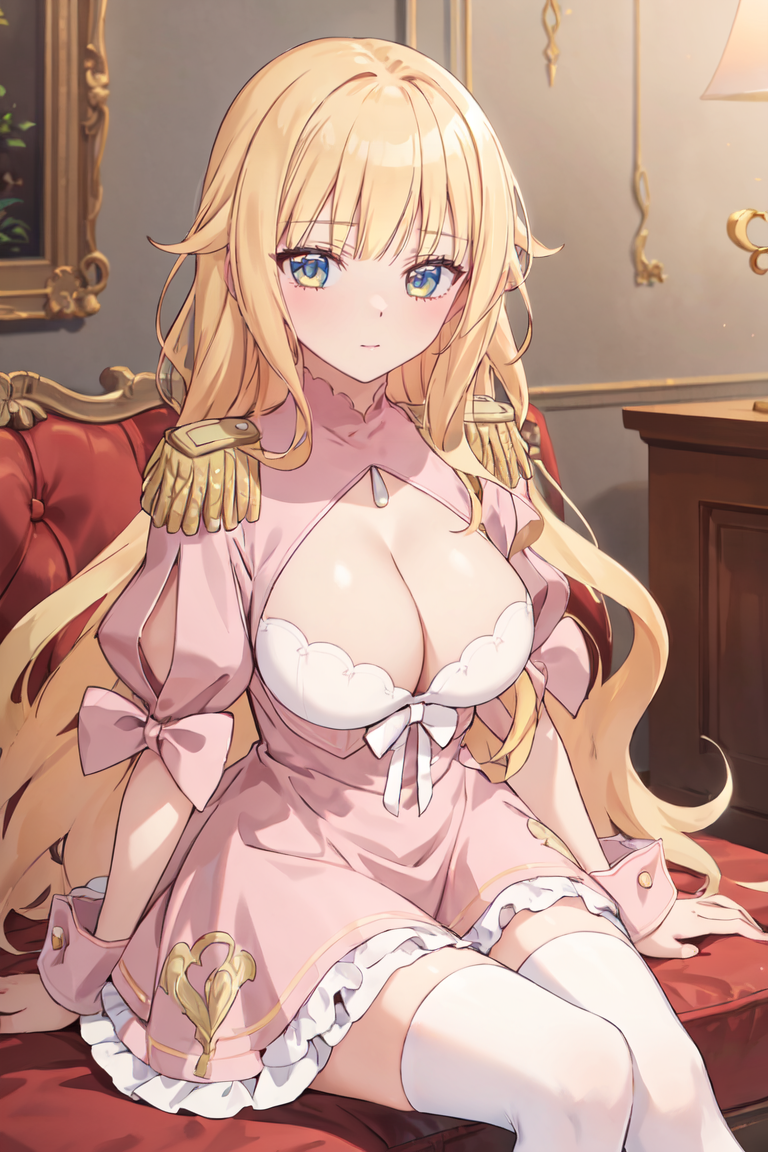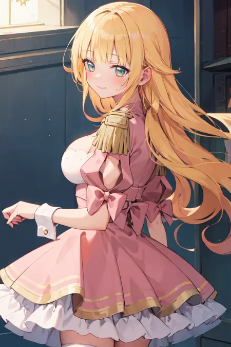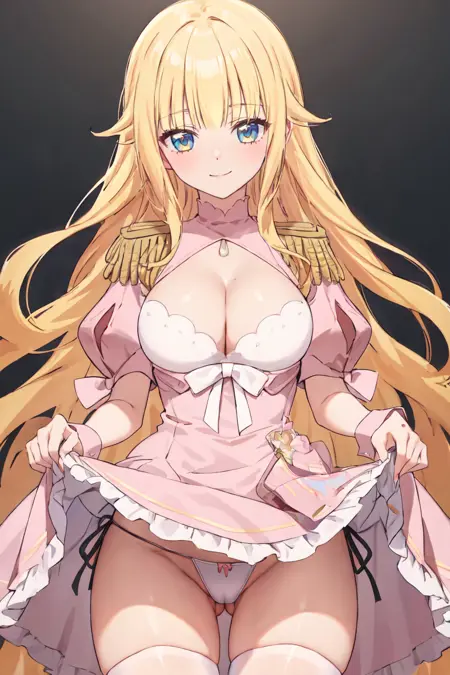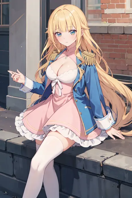 Outfit: pink dress, frilled dress, epaulettes, cleavage cutout, puffy short sleeves, wrist cuffs, white thighhighs.