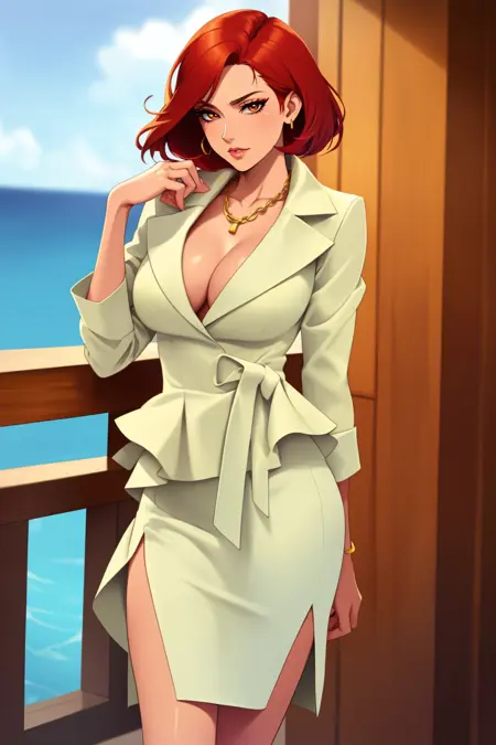 dr3ss, fashion suit dress, pencil skirt, peplum, (rose lapel pin) boutonniere:1.3, sash, sleeves rolled up, chain necklace