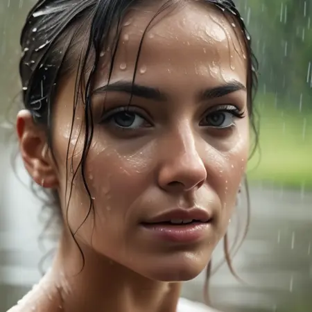 Portrait photo of a beautiful womans face in the rain. lora:rainface:0.6