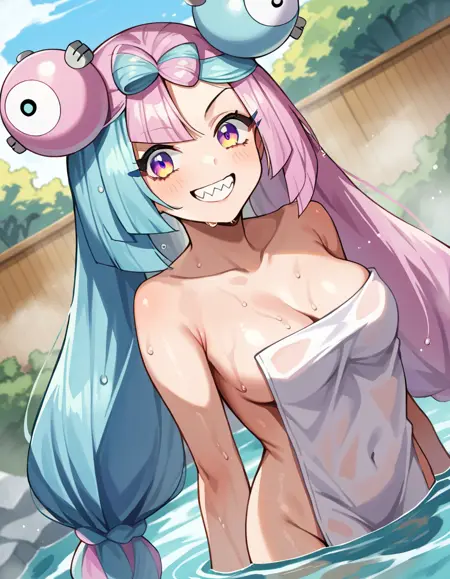 pokemon iono, blue hair, bow-shaped hair, character hair ornament, hair ornament, long hair, low-tied long hair, multicolored hair, pink hair, sharp teeth, split-color hair, twintails, two-tone hair, pink eyes,