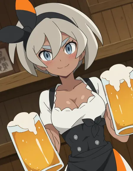 pokemonbea, blue eyes, dark skin, dark-skinned female, grey hair, hair between eyes, short hair, ribbon, hair ribbon, hairband, black ribbon, black hairband,