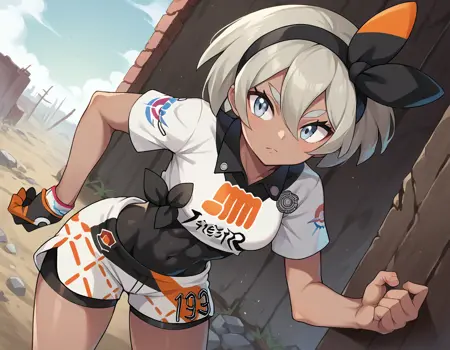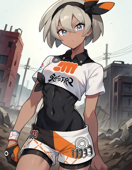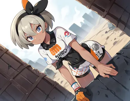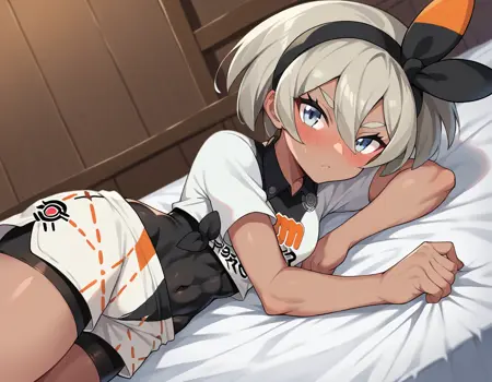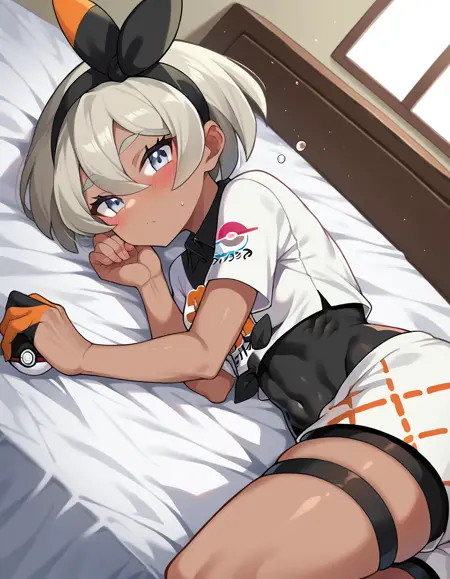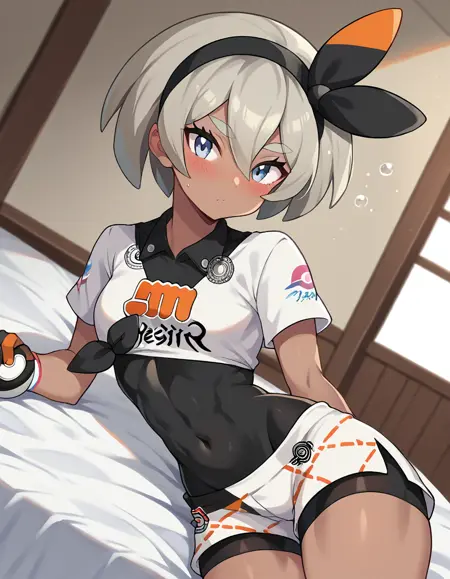 pokemonbea,蓝眼睛,深色皮肤,深色皮肤女性,灰发,头发遮住眼睛,短发,丝带,发带,黑色丝带,黑色发带,