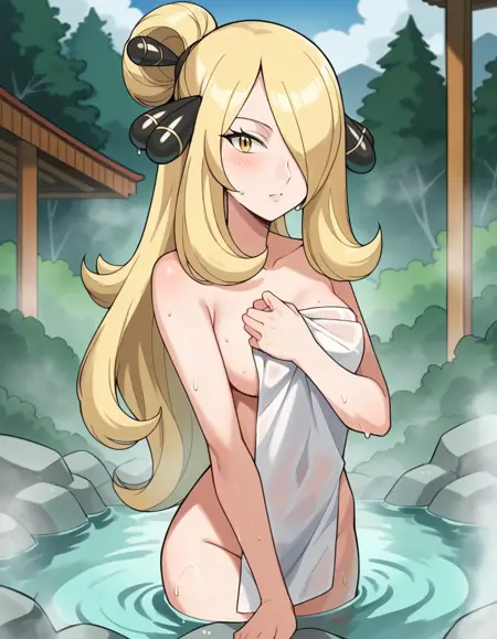 pokemoncynthia, 금발, 머리 장식, 한 눈에 덮인 머리카락, 긴 머리, 노란 눈,