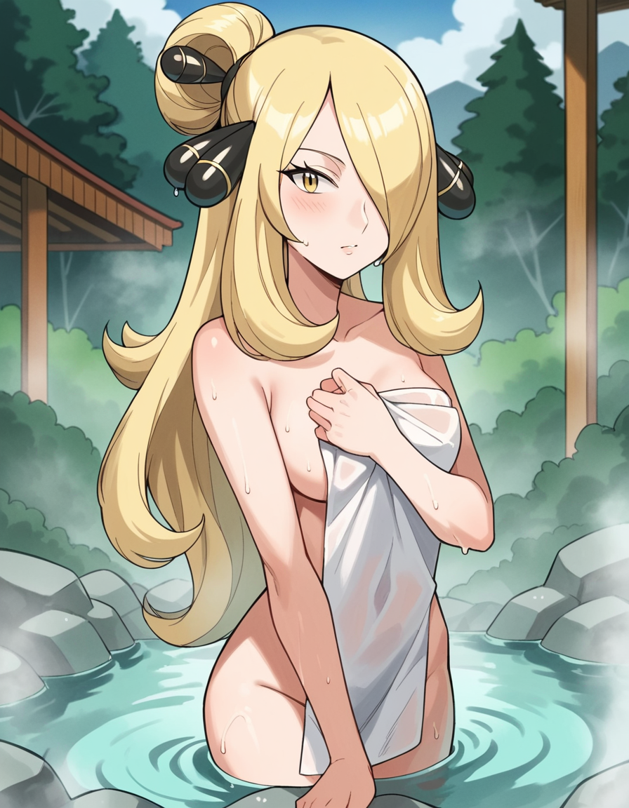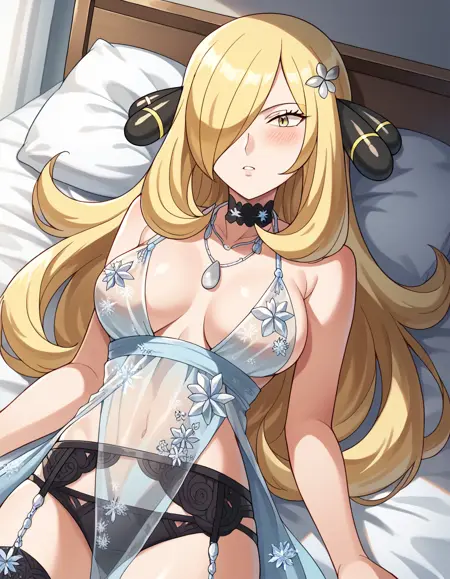 pokemoncynthia, blonde hair, hair ornament, hair over one eye, long hair, yellow eyes,