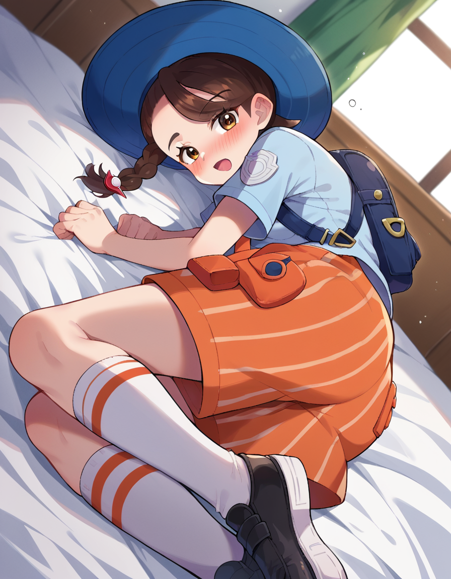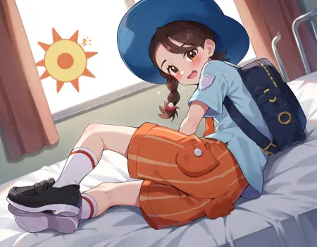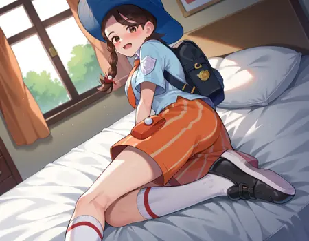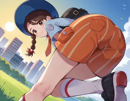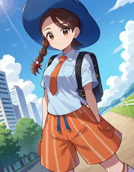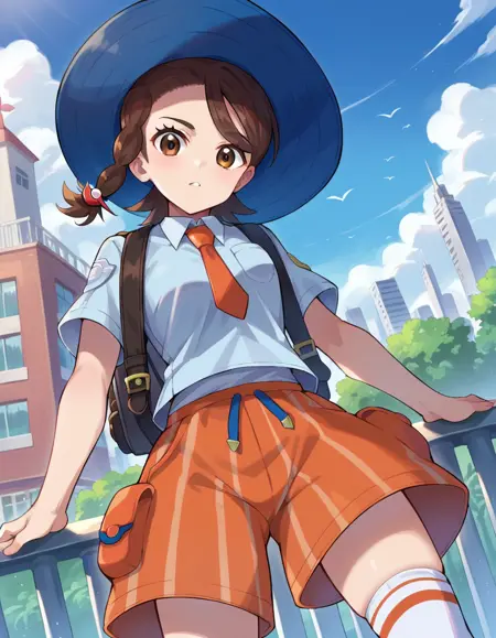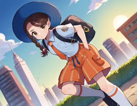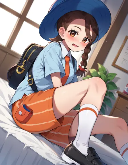 backpack, bag, black footwear, blue headwear, blue shirt, breast pocket, collared shirt, hat, kneehighs, naranja academy school uniform, necktie, orange necktie, orange shorts, pocket, school uniform, shirt, shoes, short sleeves, shorts, socks, striped, striped shorts, sun hat, white socks,
