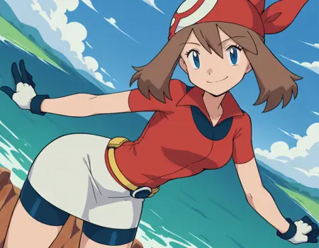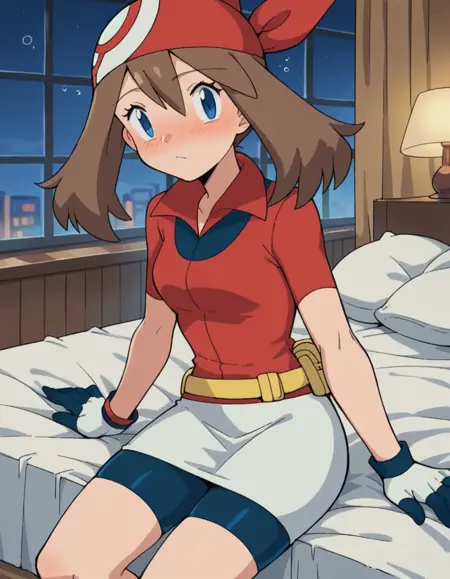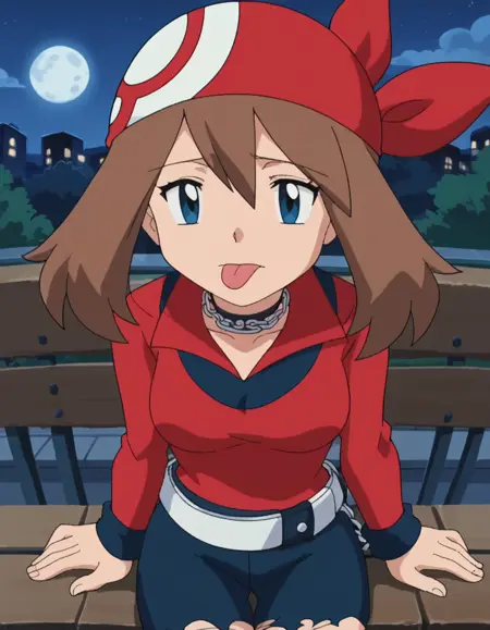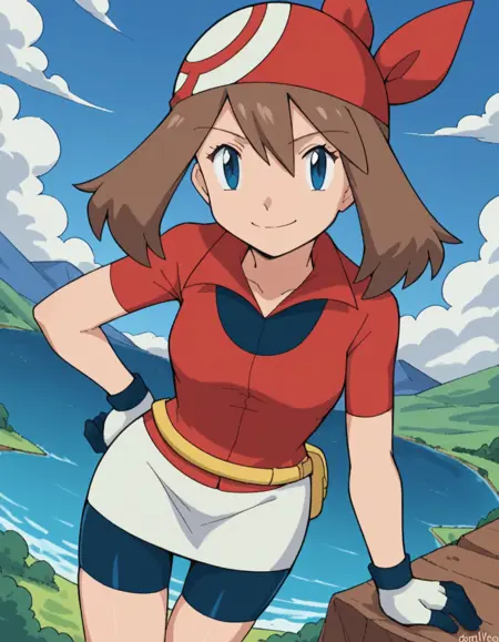 pokemonmay, blue eyes, brown hair, bandana, long hair, red bandana, twintails, hair between eyes,