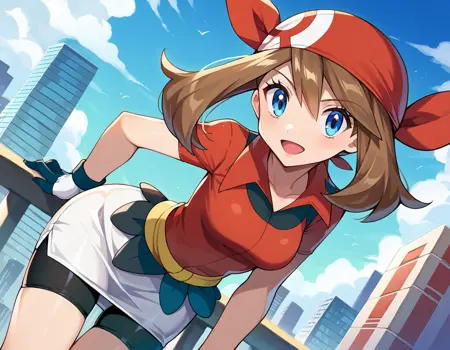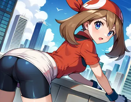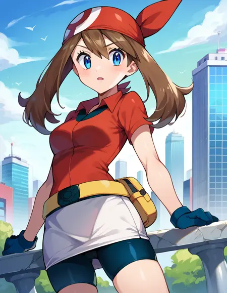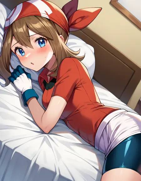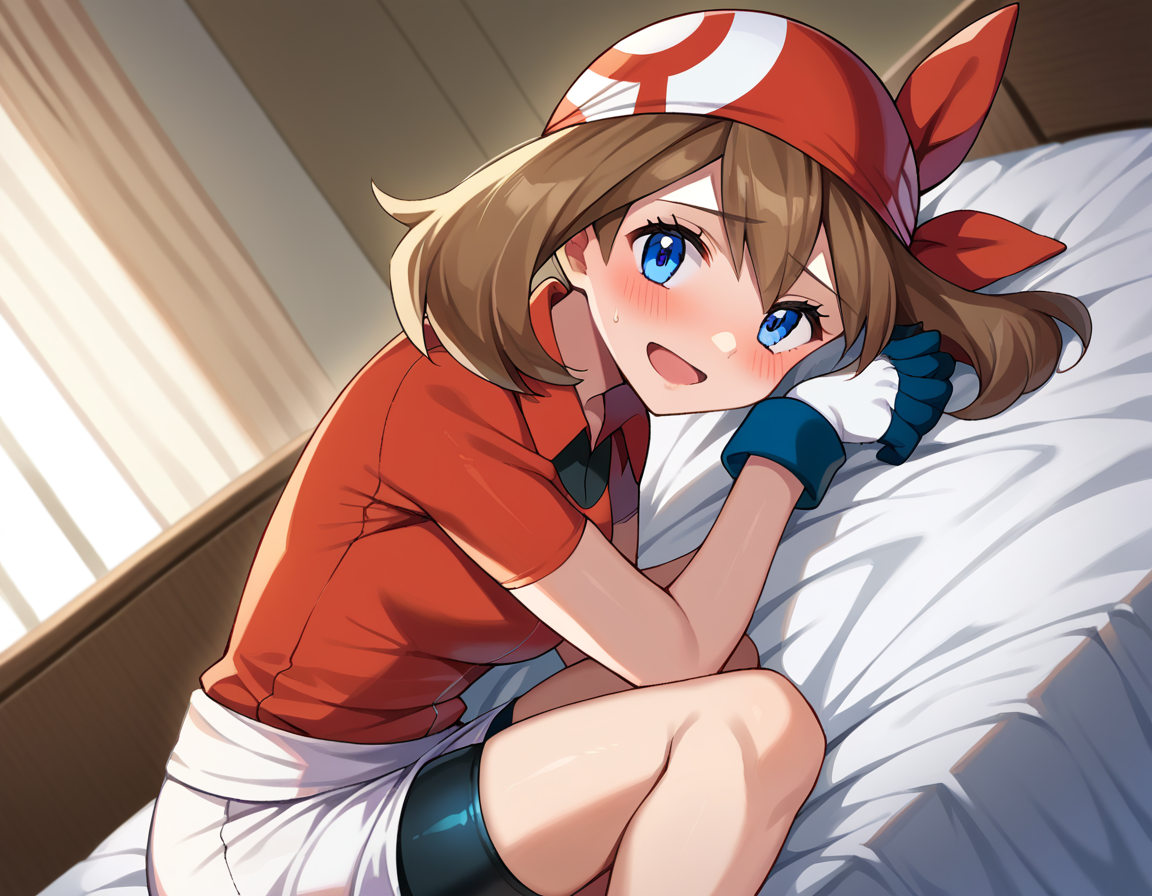 pokemonmay, blue eyes, brown hair, bandana, long hair, red bandana, twintails, hair between eyes,