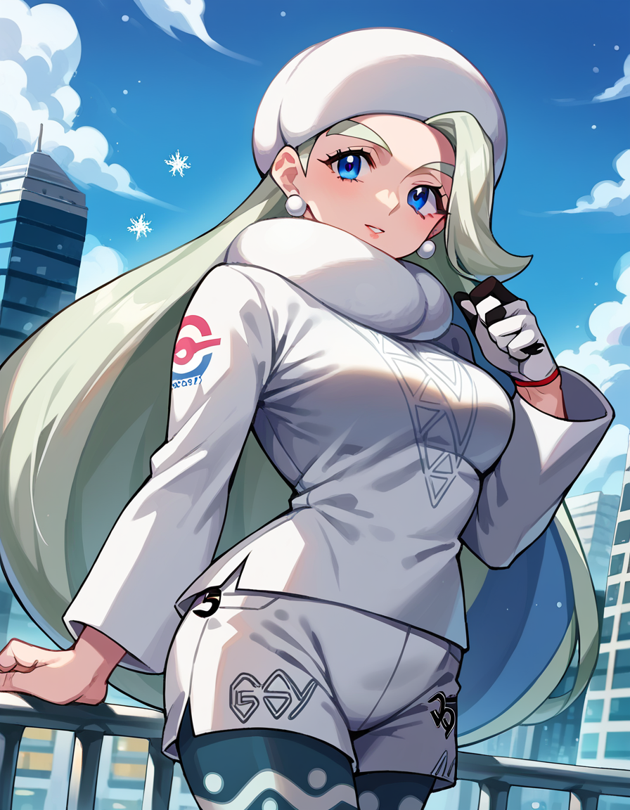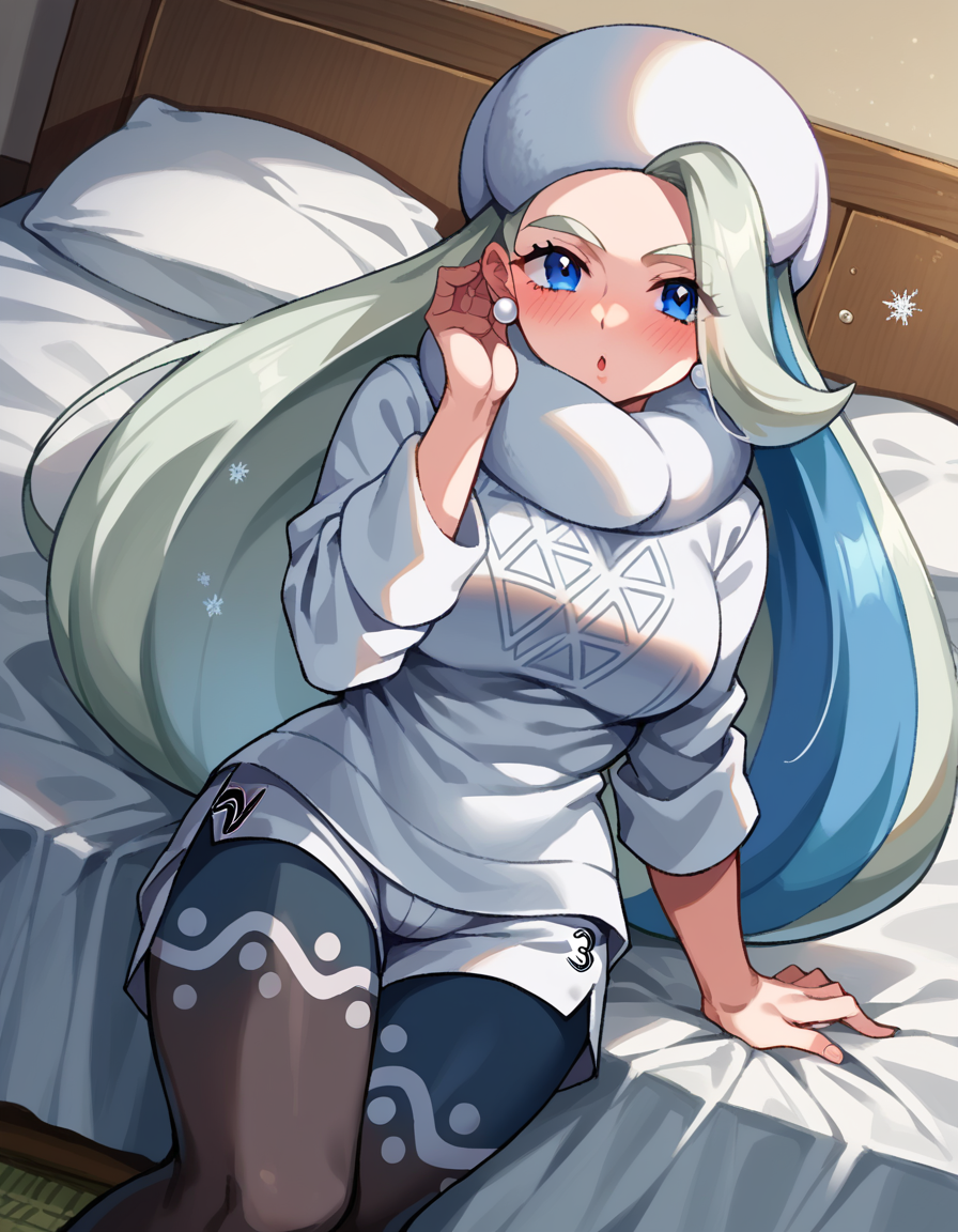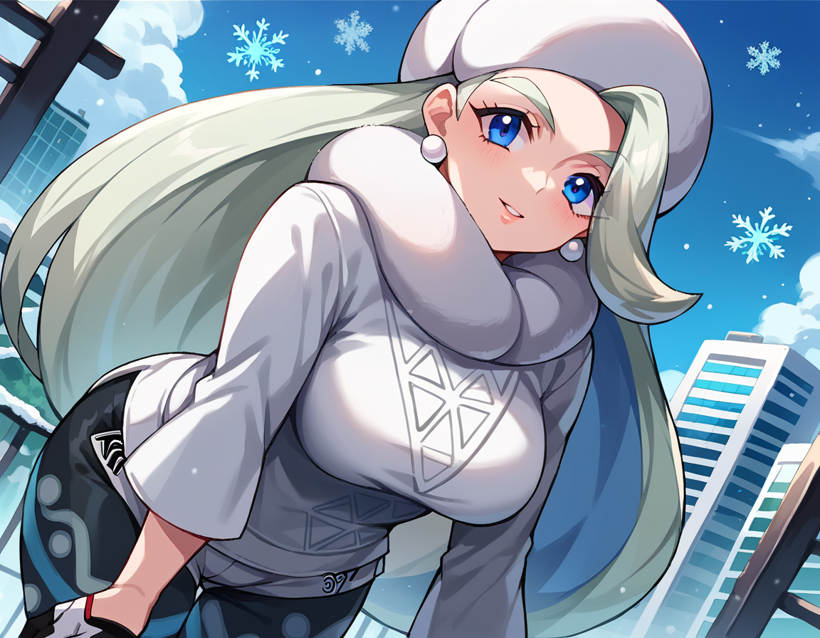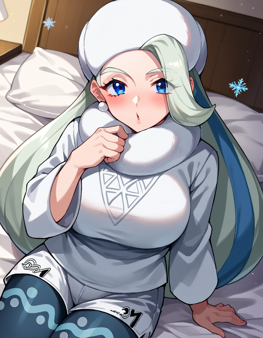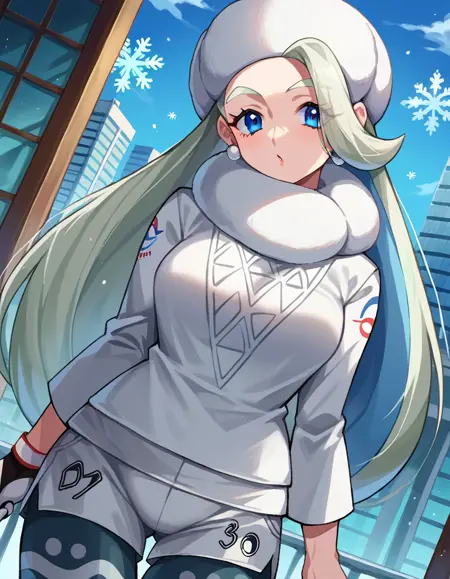 earrings, gloves, hat, jewelry, long sleeves, pantyhose, pantyhose under shorts, scarf, shorts, single glove, snowflakes, sweater, white headwear, white scarf, white sweater,