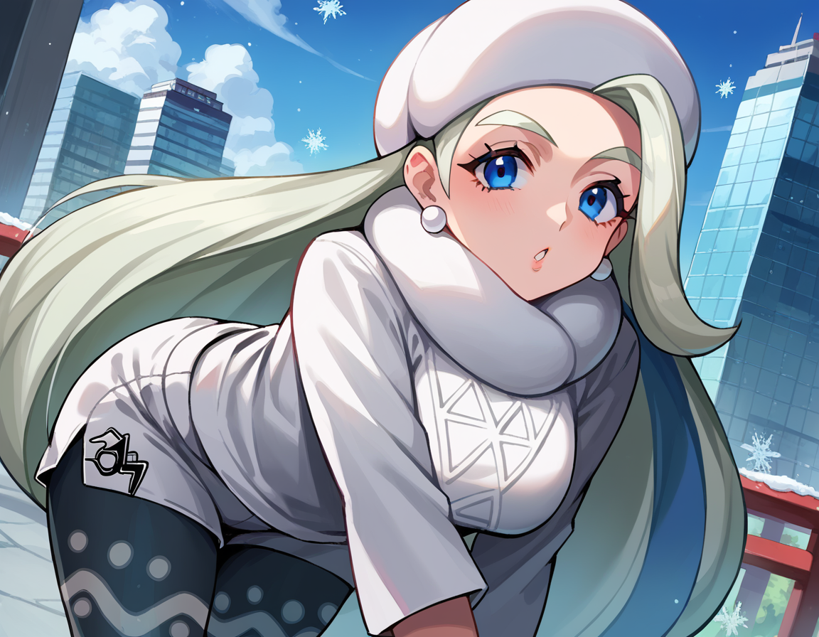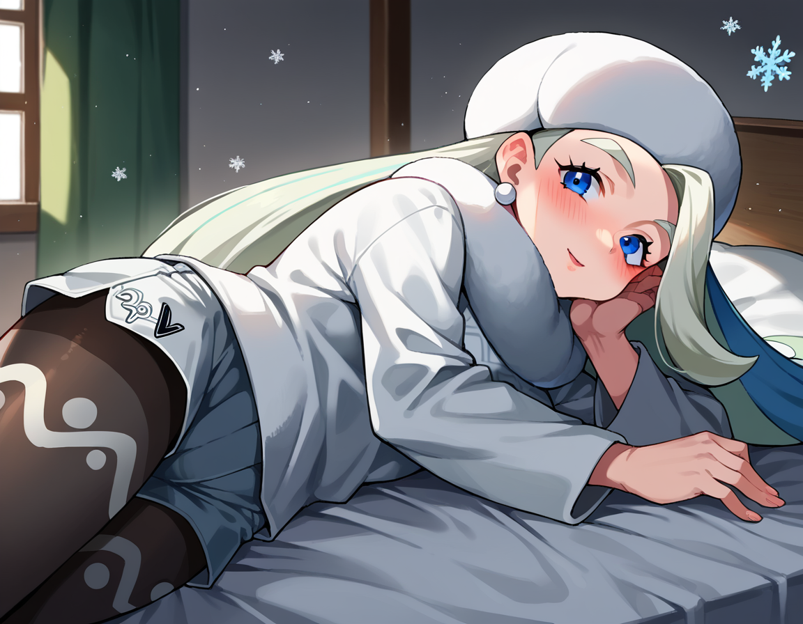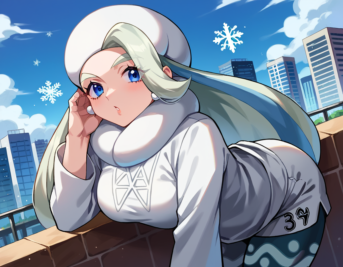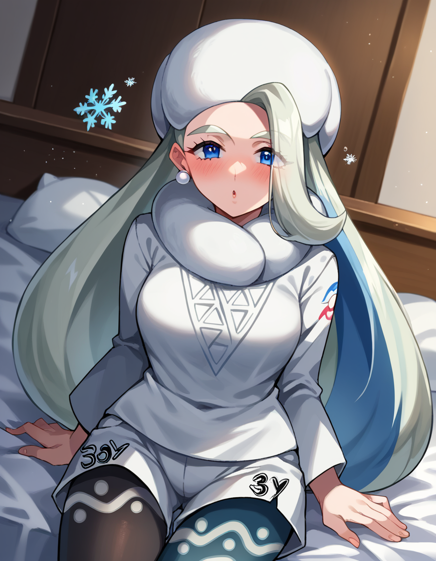earrings, gloves, hat, jewelry, long sleeves, pantyhose, pantyhose under shorts, scarf, shorts, single glove, snowflakes, sweater, white headwear, white scarf, white sweater,