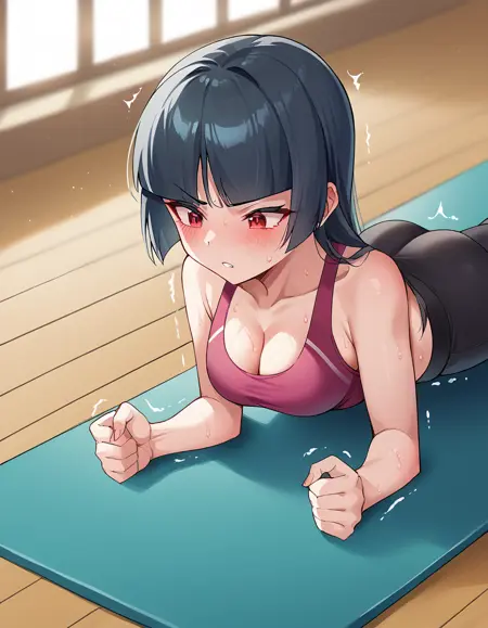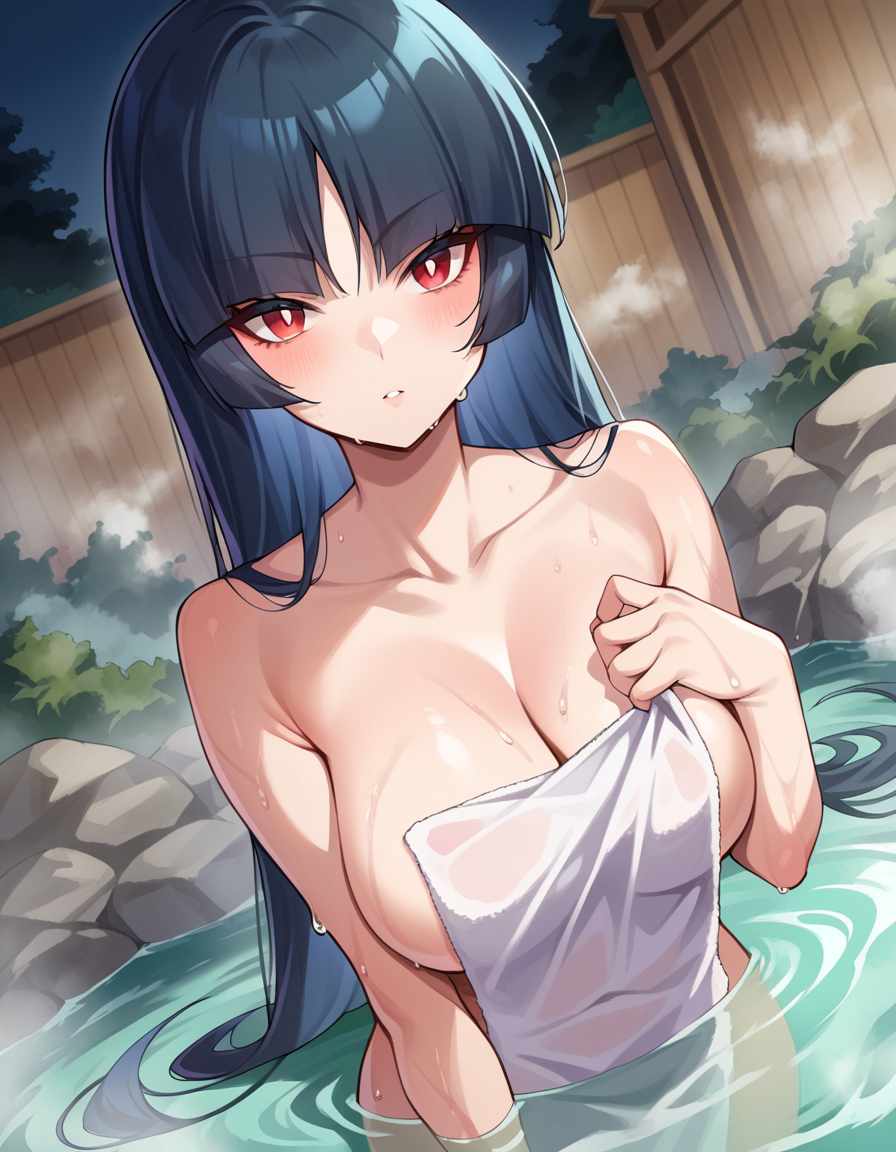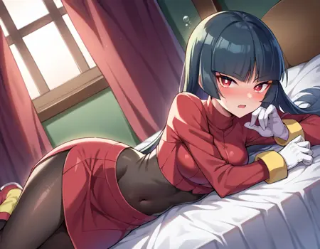 pokemonsabrina, black hair, long hair, bangs, blunt bangs, red eyes, hime cut, sidelocks, white pupils,