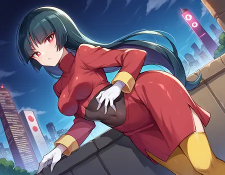 jacket, crop top, bodysuit, covered navel, midriff, red jacket, turtleneck, side slit, gloves, white gloves, long sleeves, pantyhose, skirt, red skirt, boots, red boots, socks, yellow socks, knee socks,