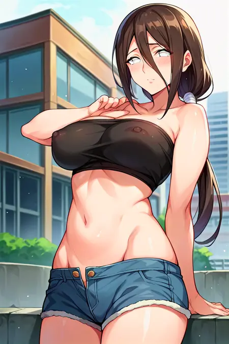 トリガー単語: hanabi, brown hair, white eyes, hair between eyes, low ponytail,