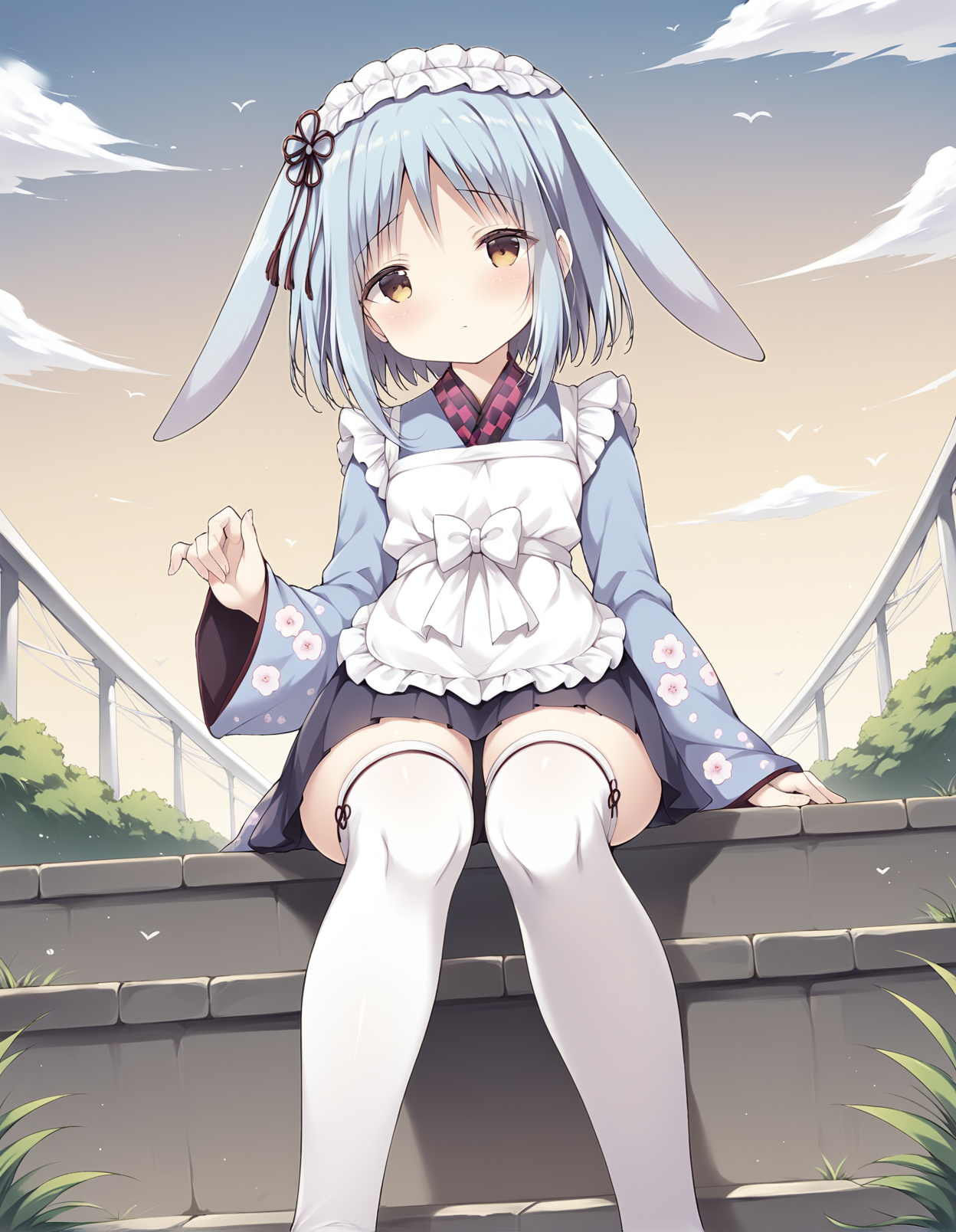 Normal Costume: frilled hairband, hair ribbon, white apron, white bow, frills, floral print, pinching sleeves, wa maid, blue kimono, print kimono, pleated skirt, thighhighs