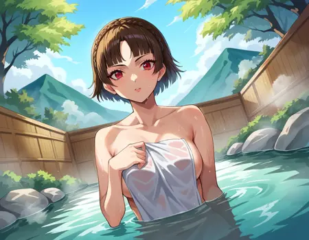 makoto nijima, blunt bangs, braid, brown hair, crown braid, red eyes, short hair,