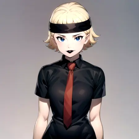 1girl, solo, Alasta Lander, short hair, blonde hair, blue eyes, black lipstick, black lips, black headband,