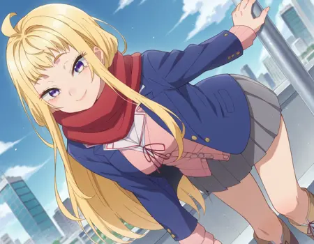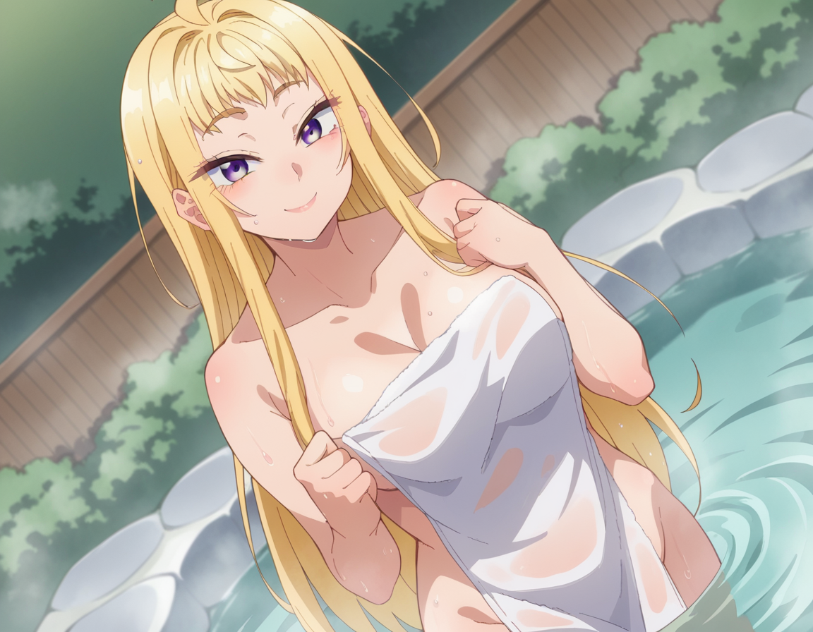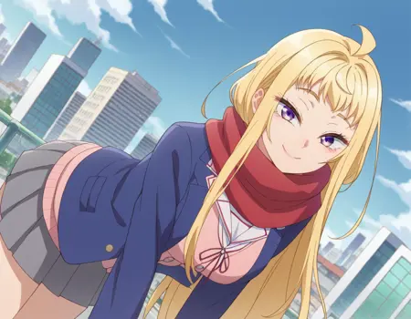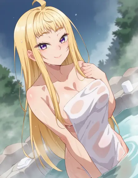 minami fuyuki, long hair, blonde hair, purple eyes, ahoge, sidelocks,