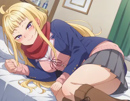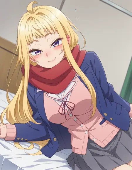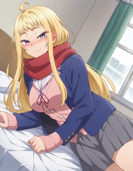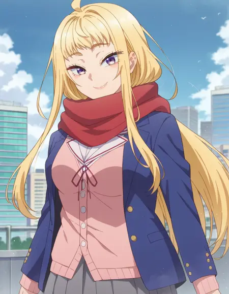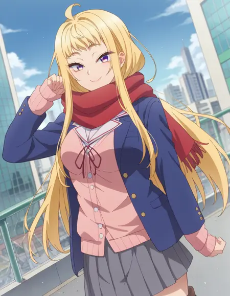 skirt, school uniform, jacket, pleated skirt, boots, scarf, blazer, cardigan, blue jacket, grey skirt, red scarf, pink cardigan,