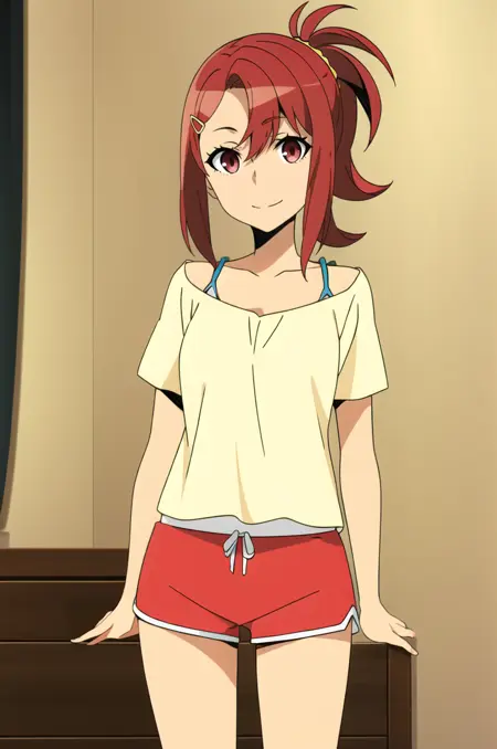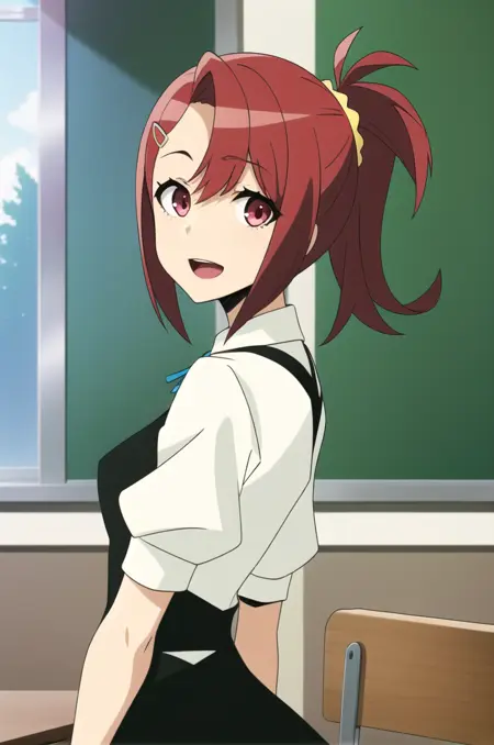 <lora:ChidoriTakashiroXL-v1-03:0.8>, ChopioChidoriTakashiro, 红发, 中长发, 闪亮头发, 马尾辫, 不对称刘海, 发夹, 红色眼睛, 发圈, (直视观众:1.3),