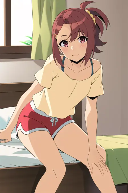 outfit_3, 黄色上衣, 文胸肩带, 短袖, 红色短裤, 海豚短裤,
