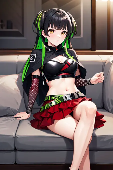 outfit5eefuyuko, long hair, two side up, multicolored hair, capelet, cleavage, crop top, black shirt, detached sleeves, long sleeves, polka dot, midriff, green belt, layered skirt, red skirt