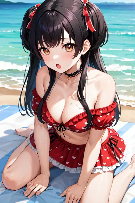 outfit3ccfuyuko, long hair, two side up, hair bow, choker, collarbone, bare shoulders, cleavage, frilled bikini, off-shoulder bikini, print bikini, red bikini, short sleeves, bikini skirt