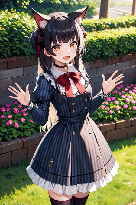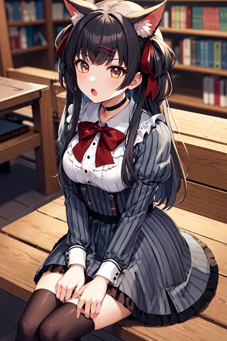 outfit6fffuyuko, long hair, two side up, animal ears, hairclip, black choker, red bowtie, vertical-striped dress, grey dress, puffy sleeves, (vertical stripes:1.2), long sleeves, striped skirt, frilled thighhighs