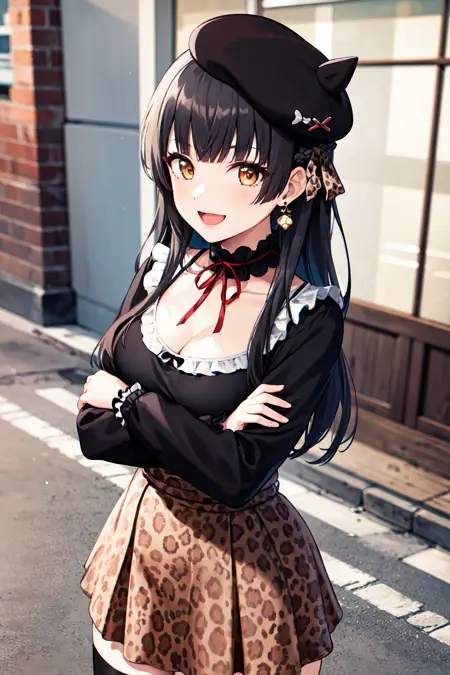 outfit4ddfuyuko, long hair, braid, beret, black headwear, fake horns, earrings, frilled choker, red ribbon, cleavage, black shirt, long sleeves, brown skirt, print skirt, leopard print, black thighhighs