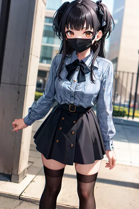 outfit2bbfuyuko, long hair, two side up, hair ribbon, earrings, neck ribbon, collared shirt, plaid shirt, grey shirt, long sleeves, (black skirt:1.3), thighhighs