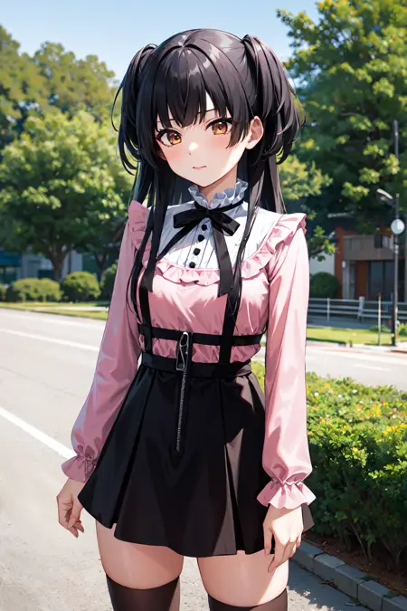 aafuyuko, long hair, two side up, jirai kei, frills, neck ribbon, pink shirt, long sleeves, zipper, black skirt, black thighhighs