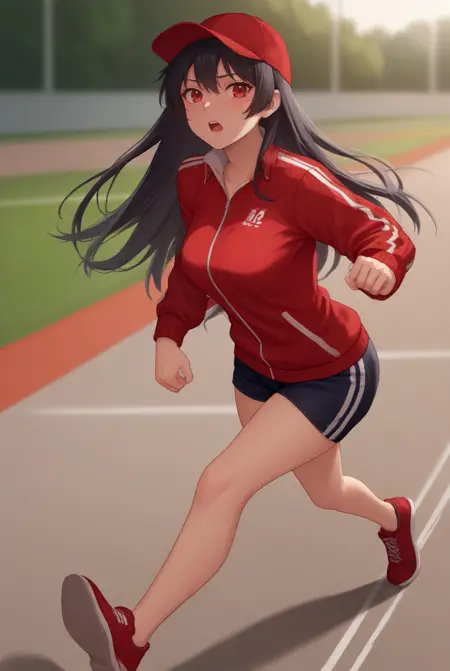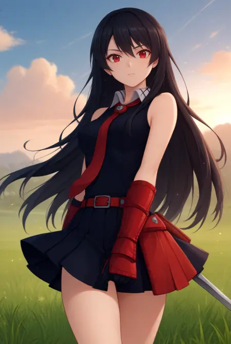의상: ["빨간 눈, 긴 머리, 검은 머리, 검은 드레스, 소매 없음, 주름치마, 검은 셔츠, 넥타이, 장갑, 빨간 벨트"]
