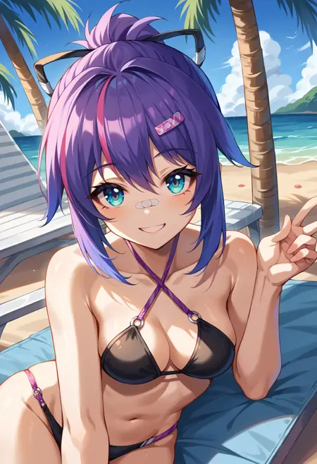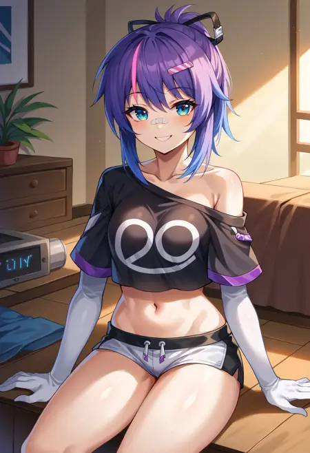 Trigger: "ProjektMelodyOriginal, bandaid on nose, short hair, ponytail, hair ribbon, hairclip" always needed, "medium breasts" suggested for accuracy.
