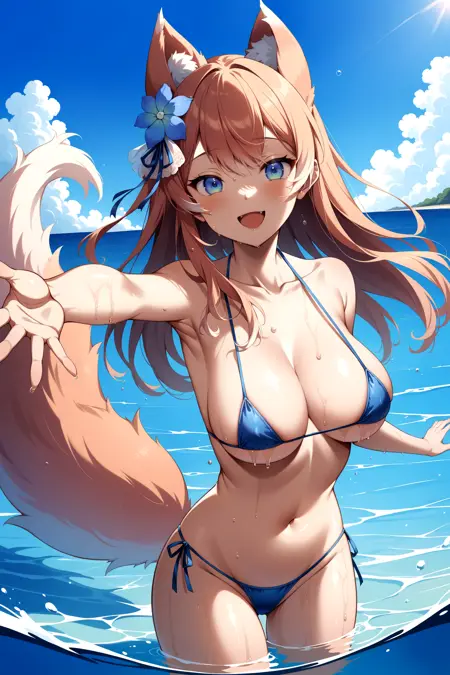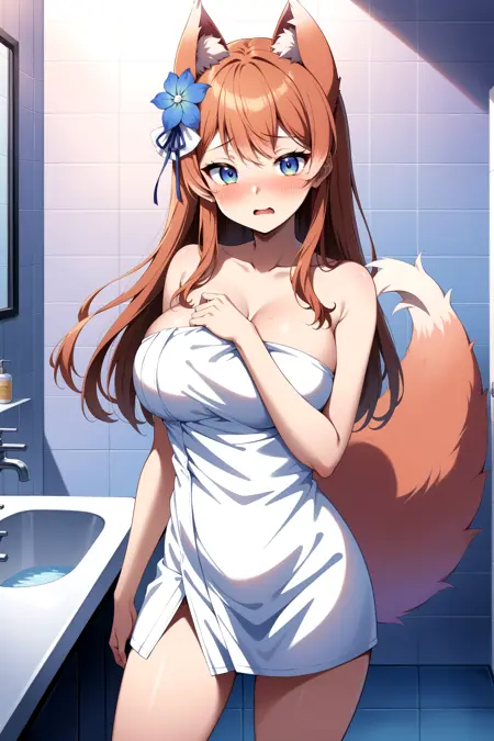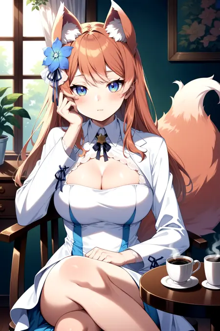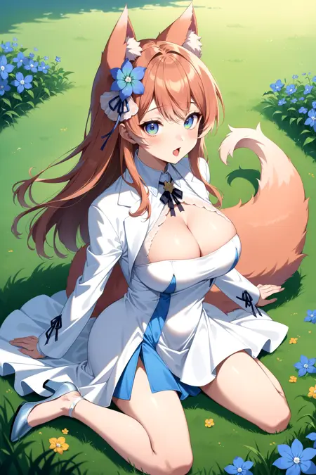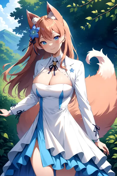 outfit2bbrurufu, long hair, animal ears, hair flower, blue flower, fox tail, breasts, neck ribbon, cleavage cutout, white jacket, white dress, long sleeves