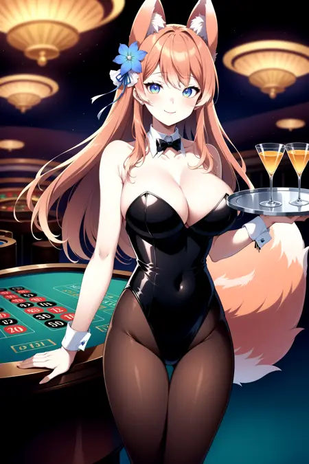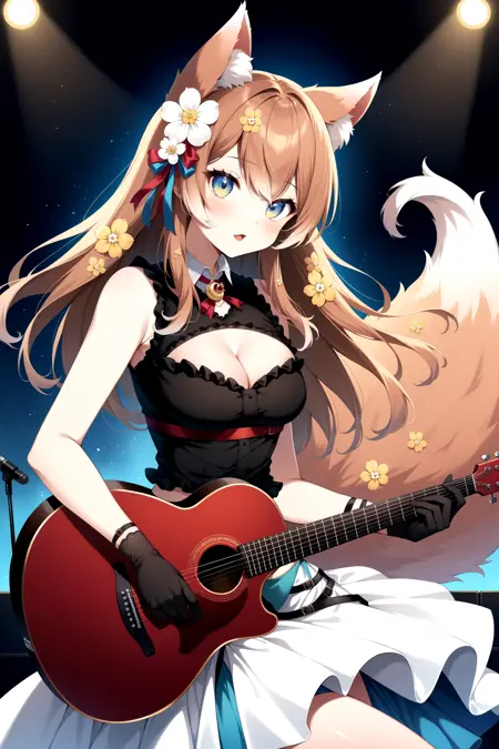 outfit1aarurufu, long hair, animal ears, hair flower, white flower, breasts, fox tail, neck ribbon, cleavage, clothing cutout, black shirt, sleeveless shirt, brown gloves, midriff, white skirt, red bow