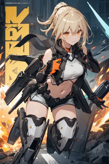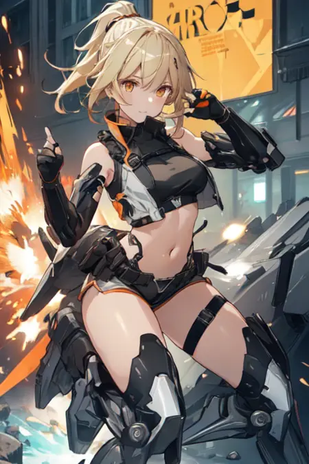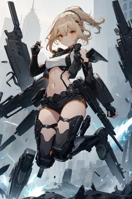 HermesAetherGazer, 1girl, solo, blonde hair, thighhighs, elbow gloves, medium breasts, ponytail, black gloves, fingerless gloves, orange eyes, covered navel, headgear, mecha musume, shorts, mechanical legs