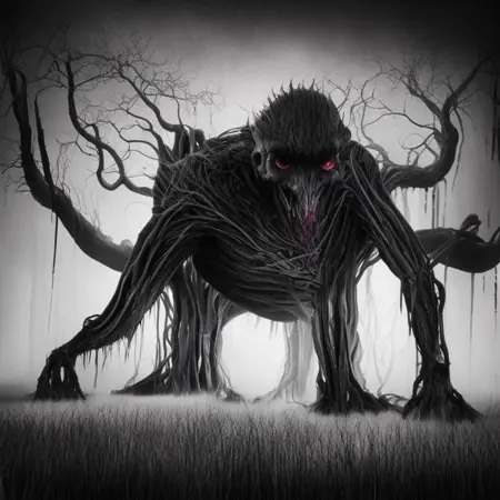 베일 너머에는 아무리 생각해도 상상조차 하지 못한 공포가 있었습니다. 끊임없이 움직이는 수많은 줄기들, 두꺼운 근육질의 것도 있었고, 가느다란 은은한 곡선을 그리는 검은 그림자들도 있었습니다. 그들의 눈은 흑백의 세계에서 흐릿한 회색 속에 순수한 검은 색으로 떠밀렸고, 마치 자기자신을 끌어당기는 자석처럼 저를 끌어당겼습니다._