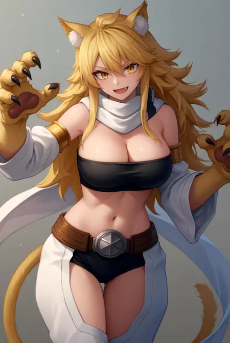 Outfit 2: ["Leone_Beast, yellow eyes, blonde hair, long hair, animal ears, animal ear fluff, animal hands, claws, tail, tube top, detached sleeves, white scarf, strapless, belt, white scarf, fang"]