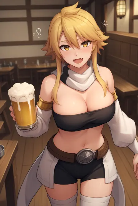 Outfit 1: ["Leone_Def, yellow eyes, blonde hair, short hair with long locks, tube top, detached sleeves, strapless, belt, white scarf, thighhighs"]